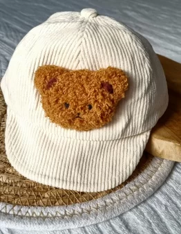 Beige Cordmütze mit Bär