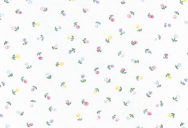 Druckstoff mit Streublümchen auf weissem Hintergrund in pink, gelb, lila, blau.