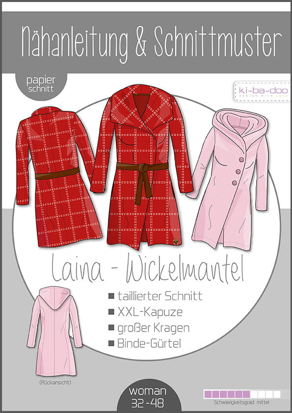 Laina ist ein Damenmantel mit zeitloser Schnittführung. Der Rücken ist durch seine Wiener Nähte schön schlank geschnitten. Der Mantel kann wahlweise mit großem Kragen oder einer Kapuze genäht werden. Die Verarbeitung sieht offene Kanten vor. Geschlossen wird er durch einen Bindegürtel, aber auch offen getragen ist der Mantel sehr schön.