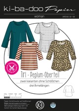 TIRI ist ein Schnittmuster für eine Peplum Bluse aus weich fallender Webware. Du nähst ein Oberteil mit klarer Form und angenehmer Weite. Der Schnitt enthält drei Varianten: