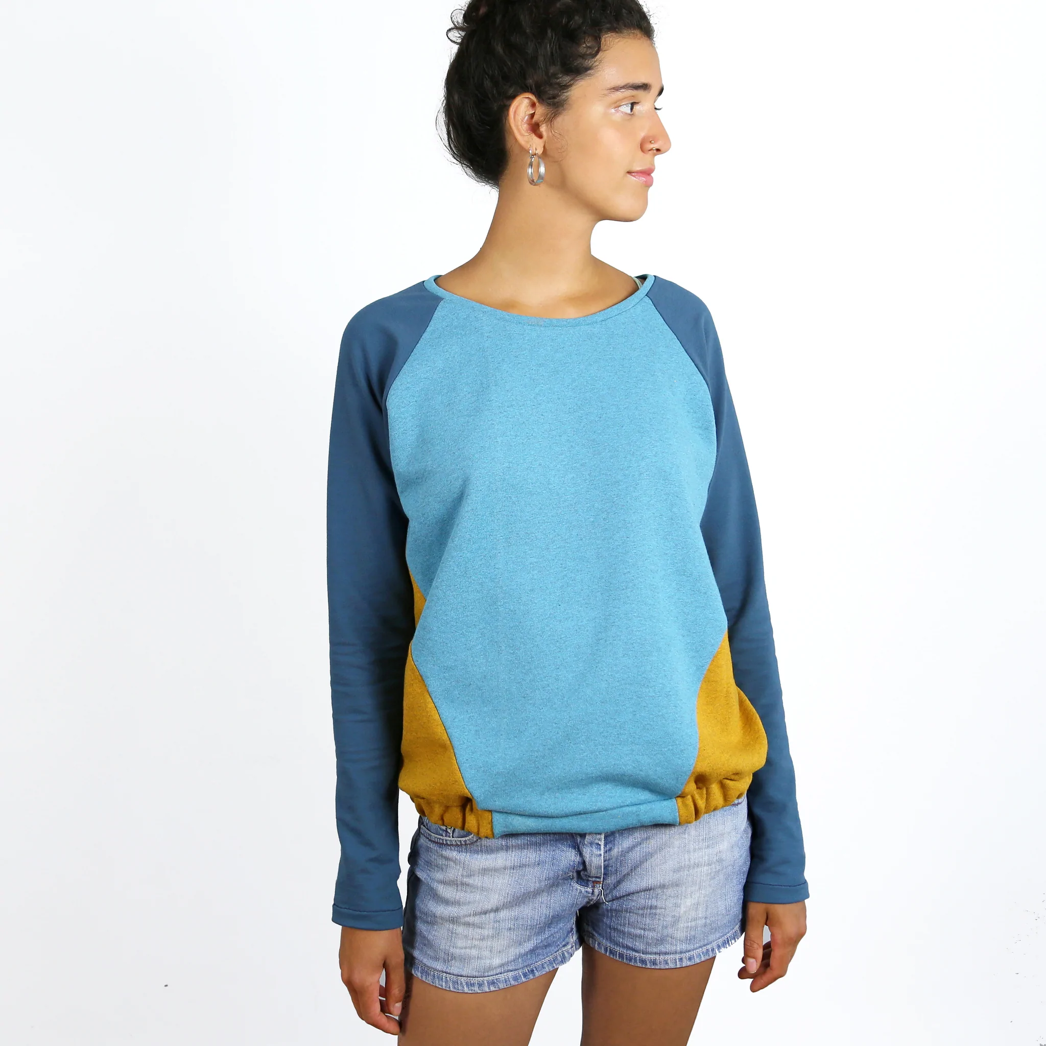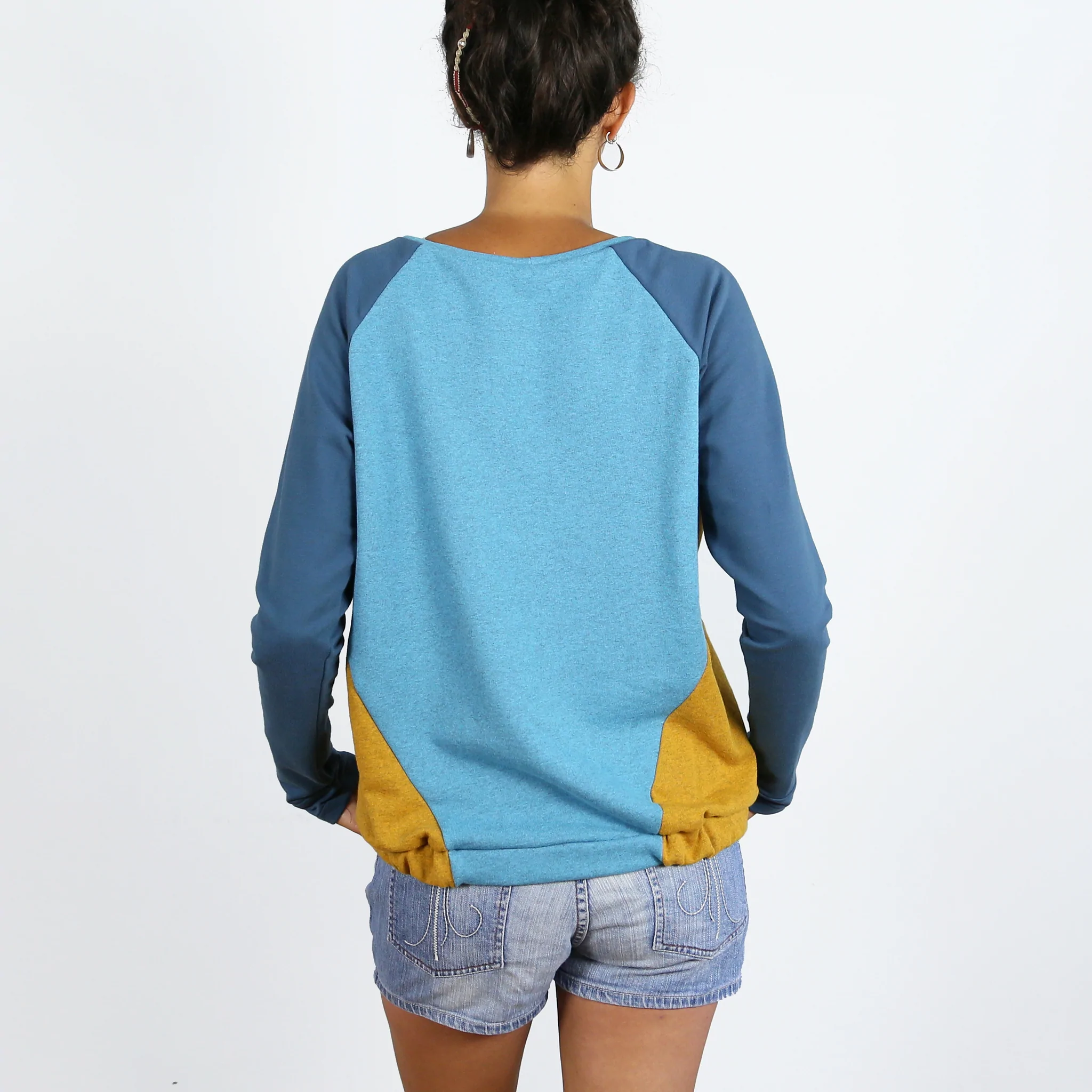 FRAU LILLE mag es kreuz und quer. Denn so laufen die Teilungsnähte über diesen lässigen Sweater – dabei entstehen spannende Vorder- und Rückenansichten, die vielseitige Variationen ermöglichen. Du kannst Muster mixen, wildes Colour-Blocking betreiben oder sie dezent aus einem einzigen Farbton nähen. Und bei Bedarf hilft Dir FRAU LILLE auch noch, Deine Sweat-Reste zu verwerten!