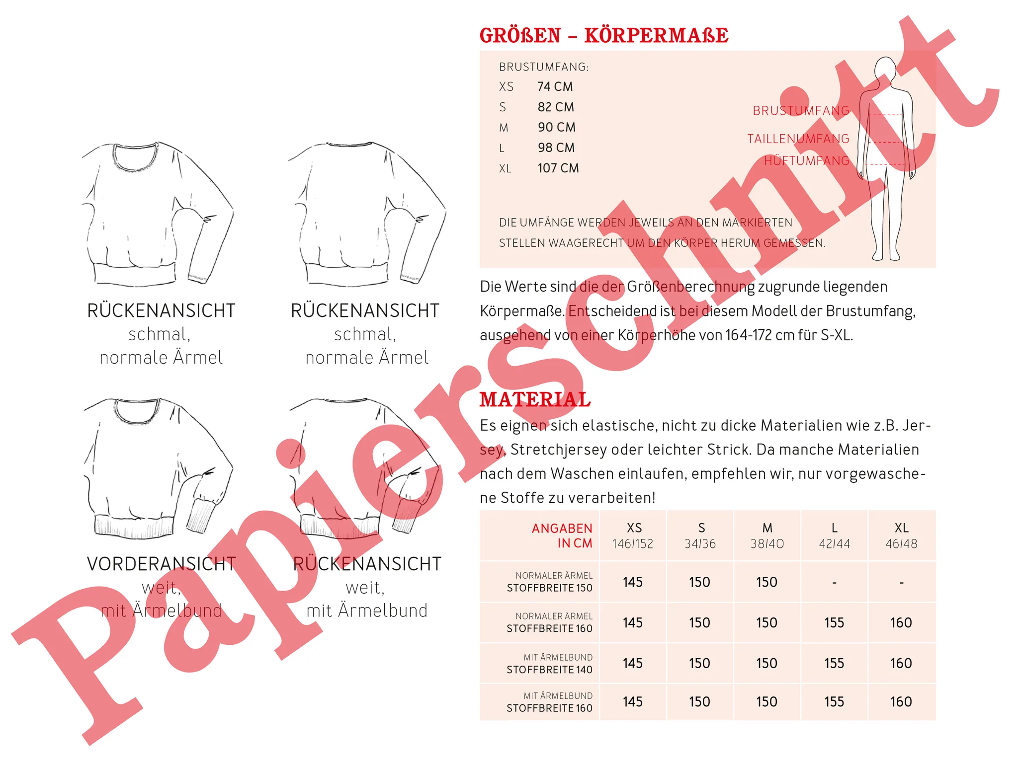 - Materialempfehlung: ausschließlich elastische Materialien wie Baumwoll- oder Stretchjerseys, Viskose- oder Modaljersey oder leichter Strick.