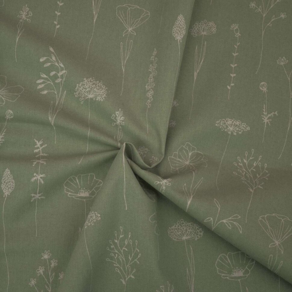 Dekostoff Fragile antik grün mit cremefarbigen Wiesenblumen